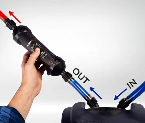 Placing it on the outlet hose of the external filter allows for even distribution of the heated water over the entire aquarium.