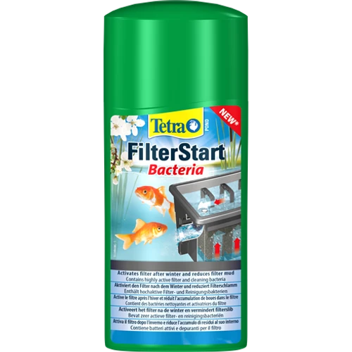 Tetra Pond FilterStart activates the pond filter after winter or when setting up a new pond and extends the intervals between cleaning. It contains a mix of highly active filter bacteria, which break down harmful substances, and sludge-reducing cleaning bacteria. Effective and beneficial bacteria in the filter are important for maintaining a healthy biological balance and good water quality. The living filter bacteria reduce the pollutants (ammonium and nitrite) in the pond. Special cleaning bacteria break down organic substances in the filter caused by fish waste and foliage in the pond water. These biological breakdown processes prevent decay. As well as its positive effect on water quality, the product increases the pond filter’s service life, extending the intervals between cleaning. Tetra Pond FilterStart has a purely biological effect. This makes it perfect for pond care and preventing contamination in the filter, particularly when the pond season starts in the spring and after filter cleaning or following medical treatment.
